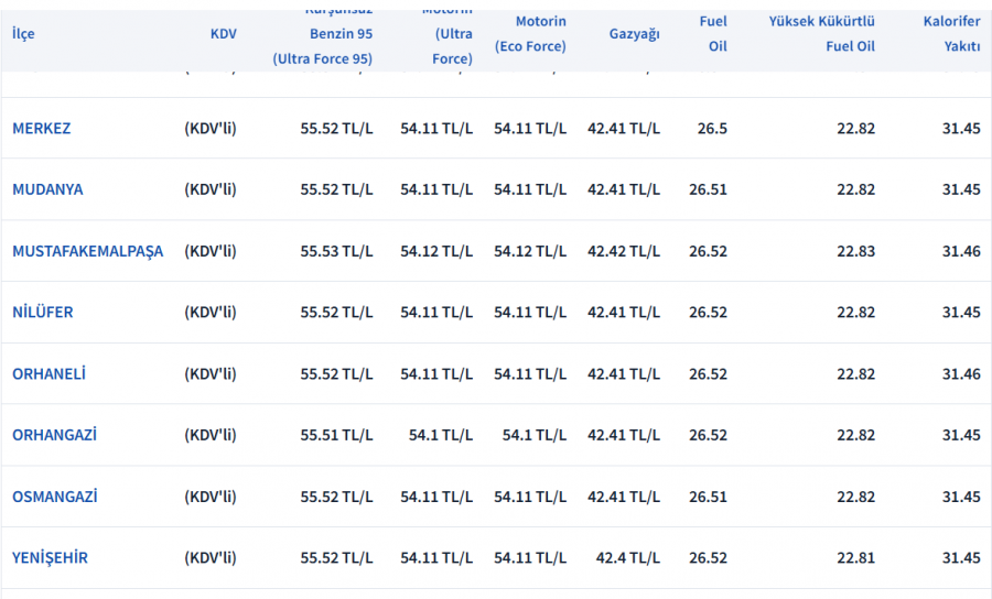 BURSA GÜNCEL AKARYAKIT FİYATLARI