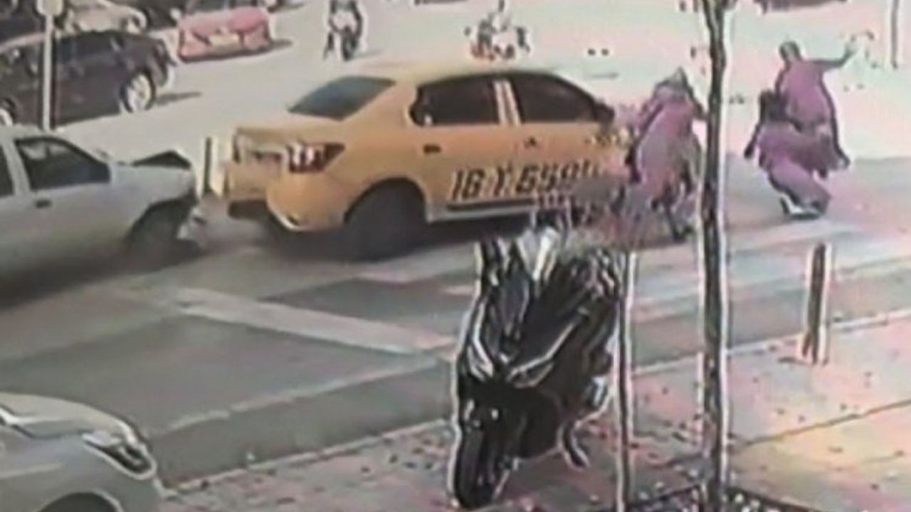 Olay, saat 12.00 sıralarında İnegöl ilçesi Sinanbey Mahallesi Ahmet Akyollu Caddesi'nde meydana geldi. Güvenlik kameralarına yansıyan olayda, cadde üzerinde seyir halinde sürücü İlhan K. (36) yönetimindeki 16 T 5589 plakalı ticari taksi, yaya geçidinden geçen yayaları görünce durdu.