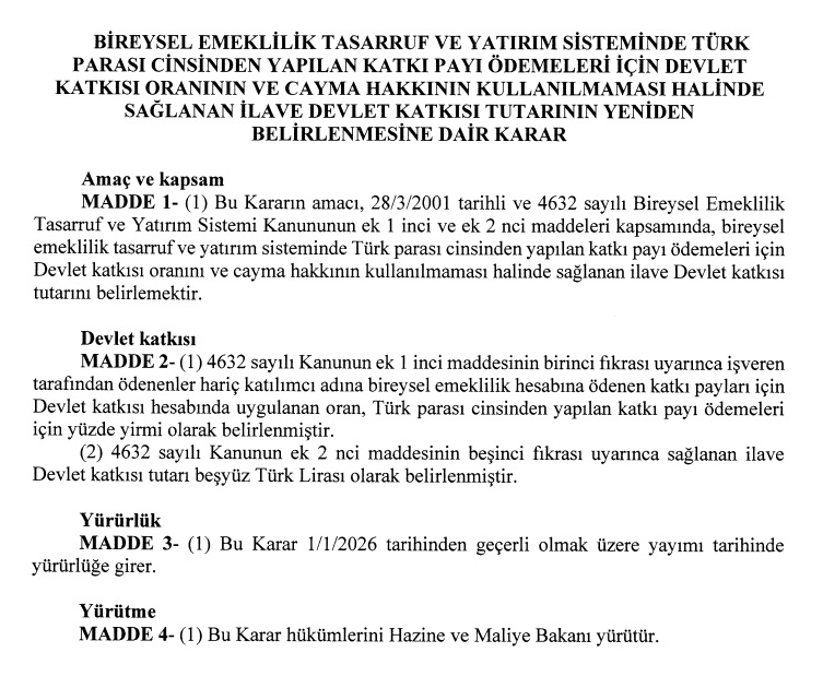 Buna göre, cayma hakkını kullanmayan katılımcılara 500 Türk Lirası tutarında ilave devlet katkısı sağlanacak. Karar, 1 Ocak 2026 tarihinden itibaren geçerli olmak üzere, yayımlandığı tarihte yürürlüğe girdi. Düzenlemenin uygulanmasından Hazine ve Maliye Bakanlığı sorumlu olacak.