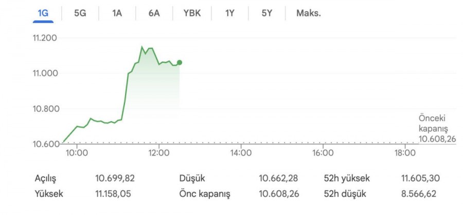 İlerleyen saatlerde BIST 100 endeksi, yüzde 4'ü geçerek 11.060.14 puan oldu.