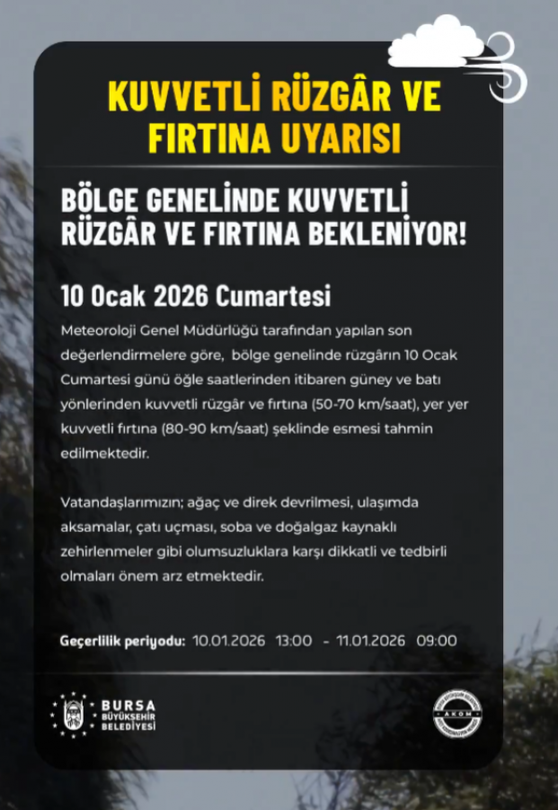Bursa Büyükşehir Belediyesi, kuvvetli rüzgâr ve fırtına uyarısının 10 Ocak 2026 saat 13.00'te başlayıp, 11 Ocak 2026 saat 09.00'a kadar geçerli olacağını belirterek, vatandaşların resmi kurumlar tarafından yapılacak duyuruları takip etmeleri çağrısında bulundu.