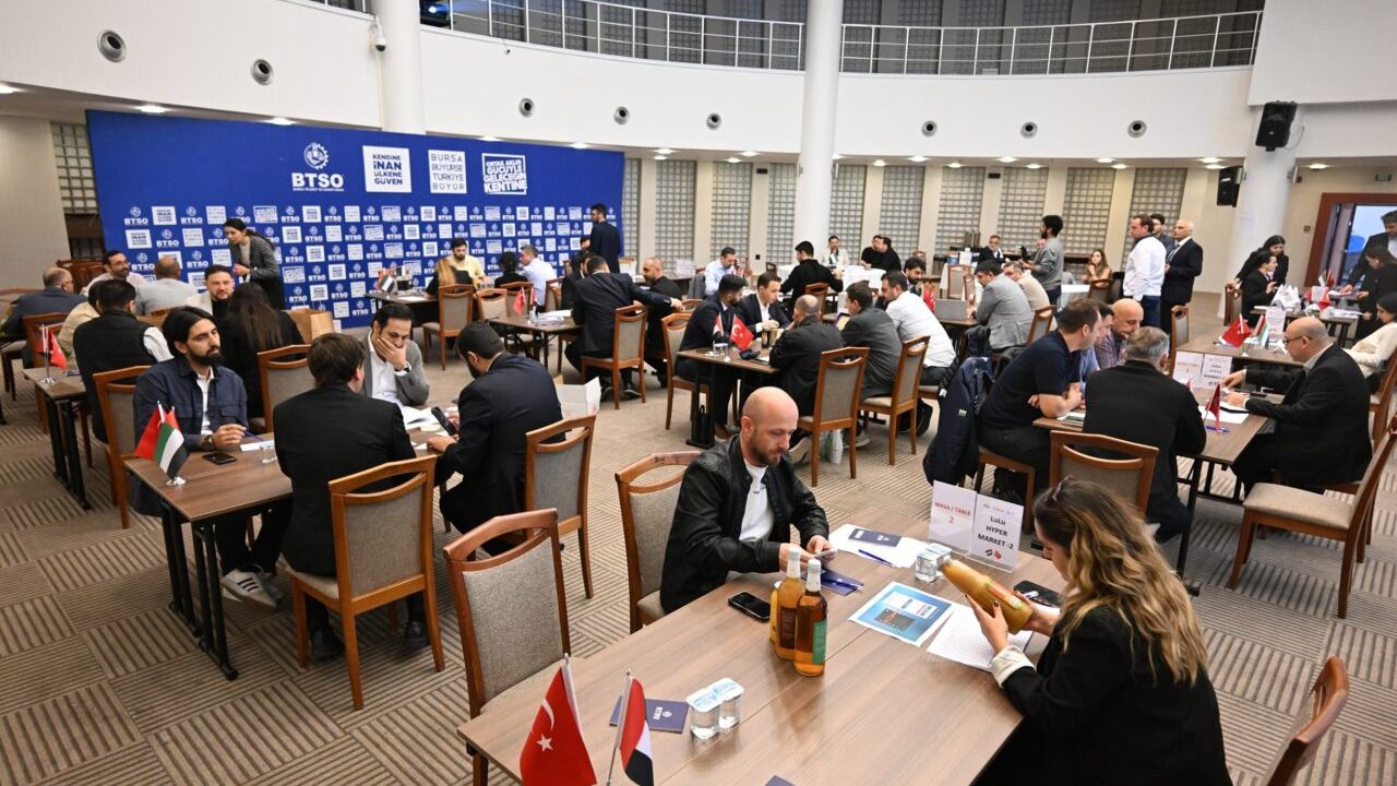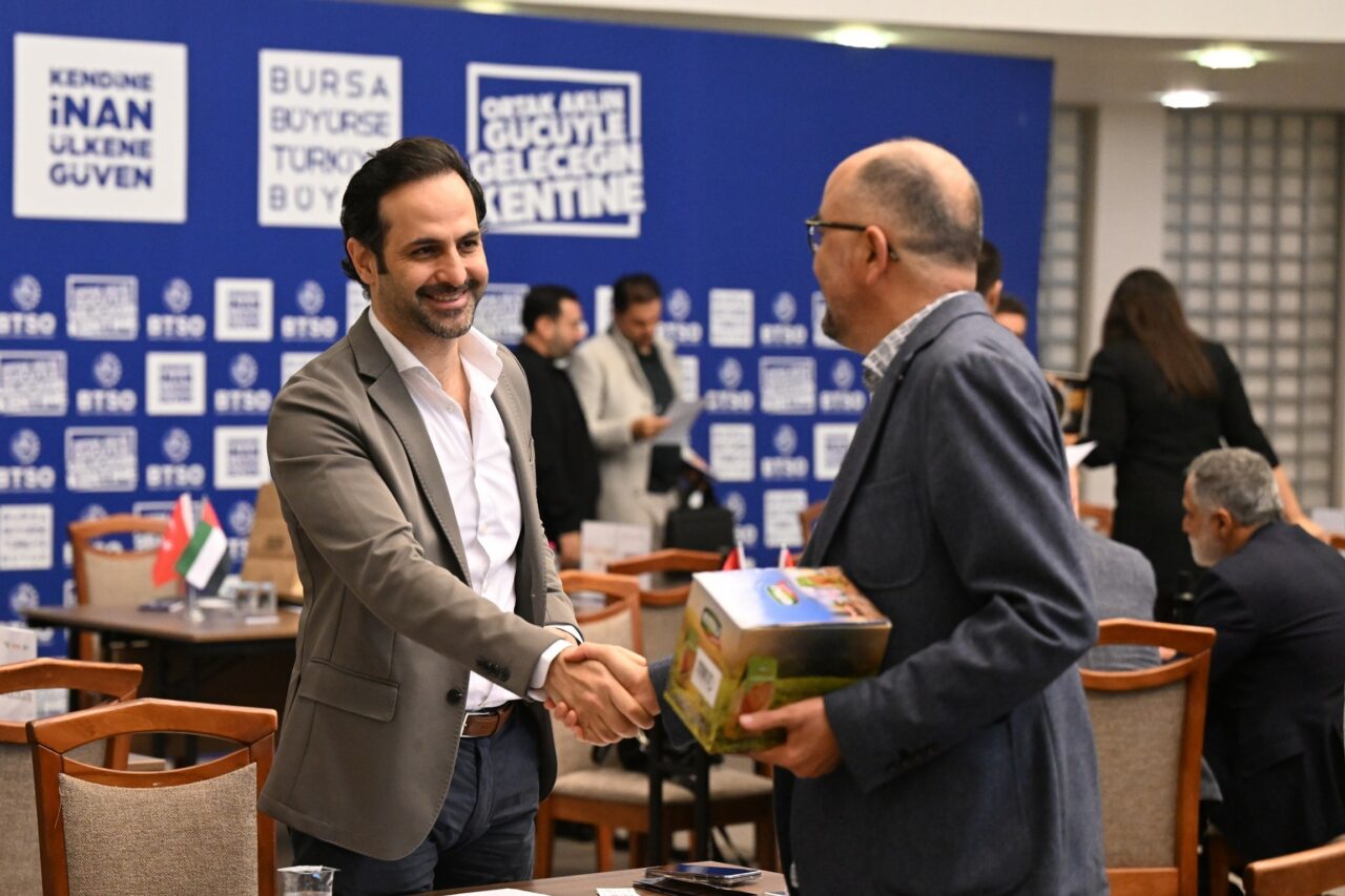 BTSO, ihracat odaklı faaliyetlerini aralıksız sürdürüyor. BAE Ankara Büyükelçiliği tarafından oluşturulan Gıda Sektörü Alım Heyeti, Bursa’da düzenlenen ikili iş görüşmeleri etkinliğinde BTSO üyeleri ile bir araya geldi. BAE Ankara Büyükelçisi Saeed Thani Hareb Al Dhaheri ve BAE Franchise Derneği Yönetim Kurulu Başkanı Noor Altamimi’nin de eşlik ettiği ticaret heyetini, BTSO Yönetim Kurulu Başkan Yardımcısı Cüneyt Şener ve Meclis Başkan Yardımcısı Murat Bayizit ile Gıda ve Paketli Ürünler Konseyi Başkanı Burhan Sayılgan karşıladı. Gün boyu devam eden etkinlikte, Bursalı firmalar yoğun görüşmeler gerçekleştirirken, yeni iş birliklerinin de temelleri atıldı.