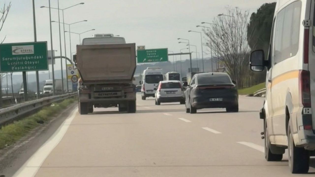 Bursa Çevre Yolu’nda seyir halinde olan bir hafriyat kamyonu, uzun araçların geçişine yasak olan en sol şeride girerek bir süre ilerledi. Kamyon sürücüsü trafik güvenliğini tehlikeye düşürerek, süratli şekilde yoluna devam etti.