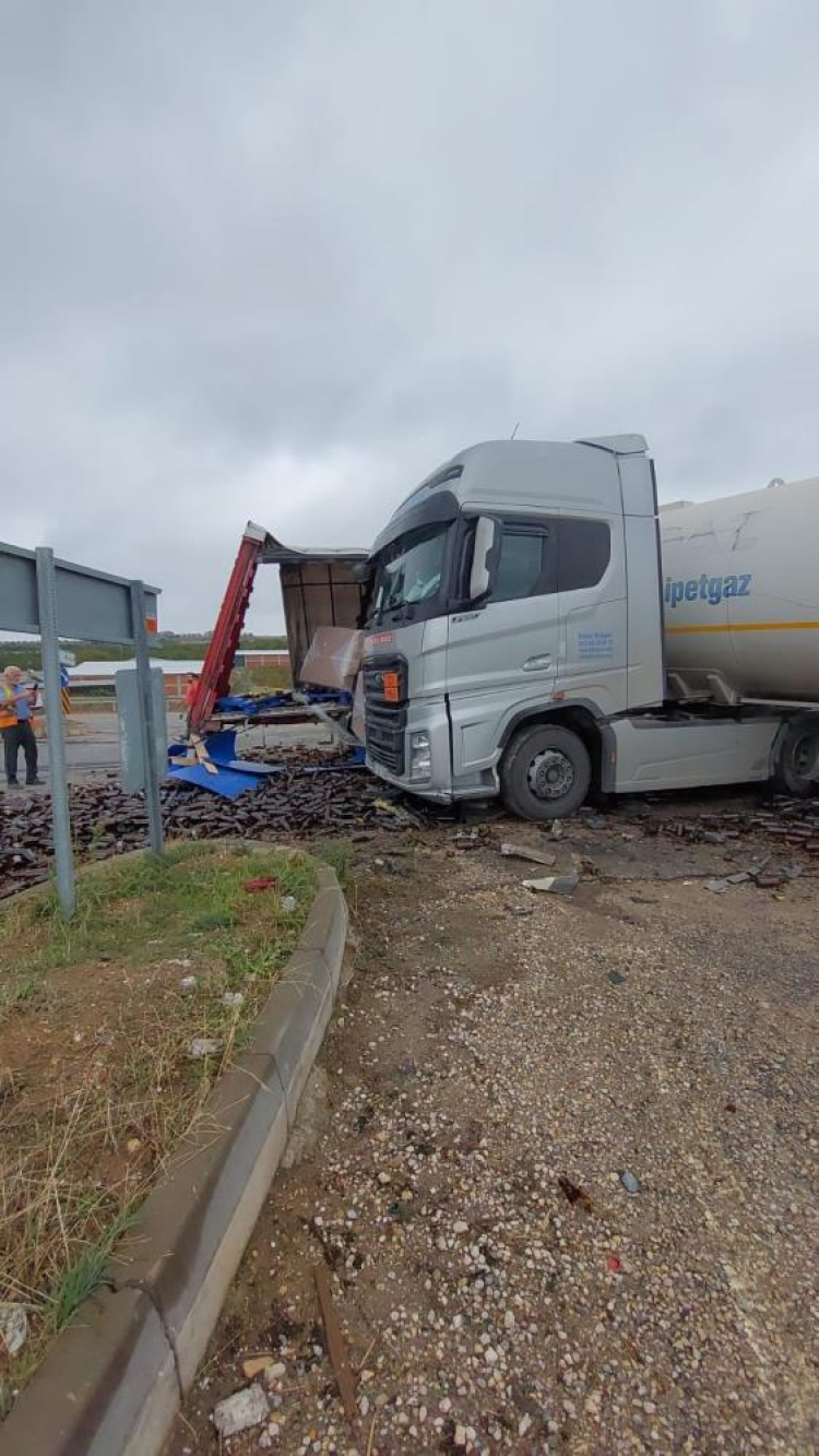 Yol üzerinde seyir halinde olan Sürücü yönetimindeki şişe yüklü TIR, ara yoldan çıkan sürücü Ekrem K. Yönetimindeki tanker ile çarpıştı.
