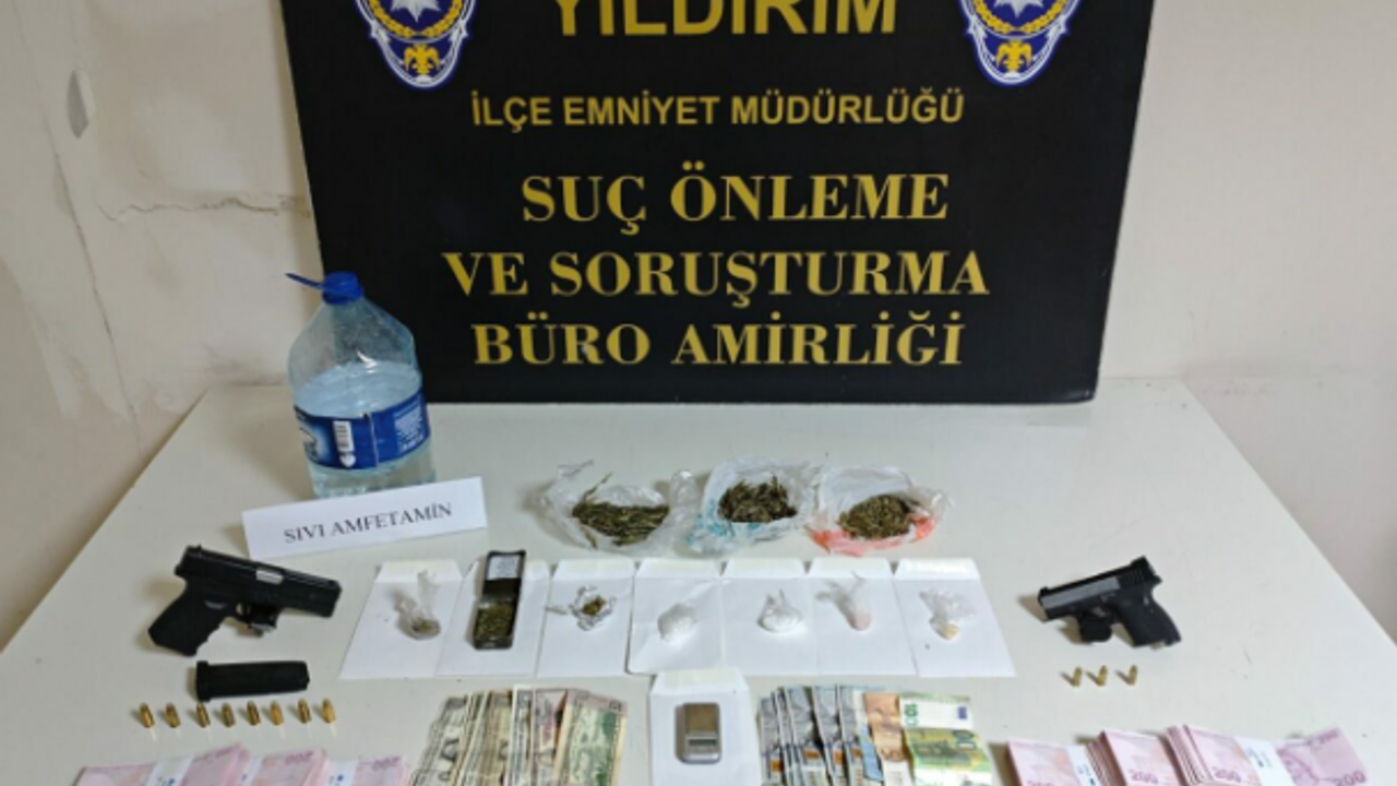 Yapılan baskında Y.A.’nın yanı sıra evde bulunan M.P. ve E.Ö. de gözaltına alınırken, aramalarda 2 ruhsatsız tabanca, 1 litre 730 mililitre sıvı metamfetamin, çeşitli miktarda skunk, bonzai, metamfetamin, eroin, 1 adet hassas terazi ve uyuşturucu ticaretinden elde edildiği değerlendirilen 96 Bin 600 TL, 807 Dolar ve 170 avro nakit para ele geçirildi.
