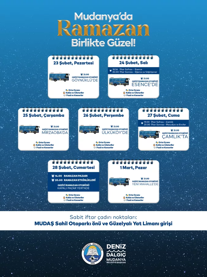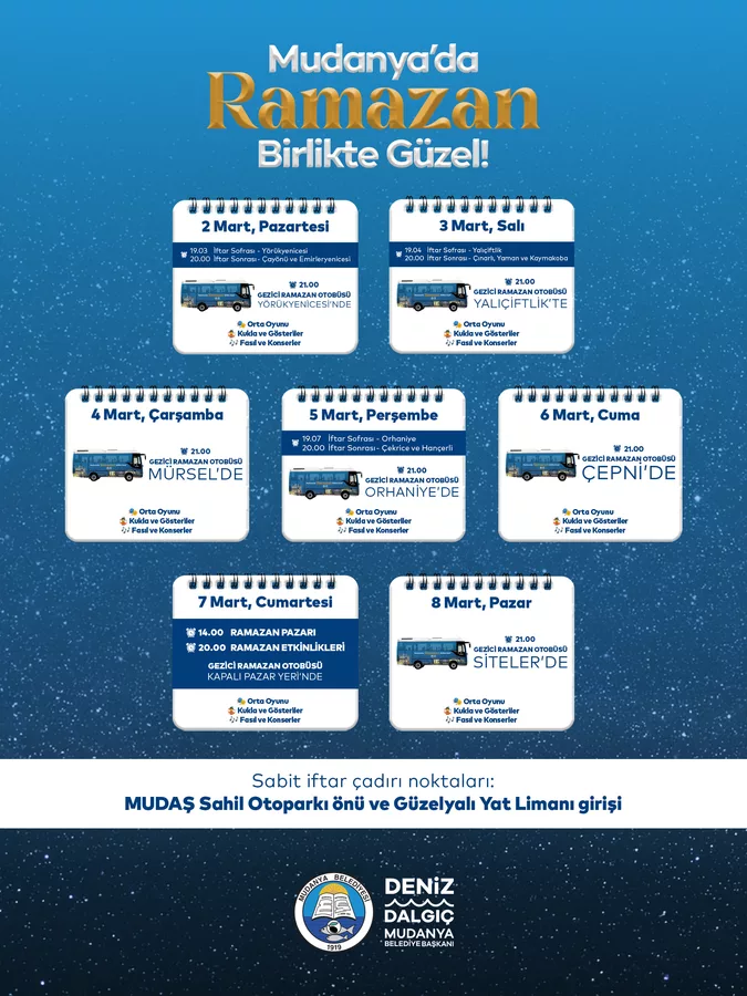 Ramazan ayı için hazırlanan Gezici Ramazan Otobüsü, ay boyunca sofraları ve etkinlikleri mahallelere taşıyacak. İftar sofralarının kurulacağı mahallelerde kukla gösterileri, orta oyunları ve fasıl dinletileri düzenlenecek; çocuklara yönelik atölyeler gerçekleştirilecek. Mudanya'nın dört bir yanındaki mahallelerde Ramazan'ın paylaşma ve dayanışma ruhu birlikte yaşatılacak. Her Cumartesi Dolgu Alanı Kapalı Pazar Yeri'nde kurulacak Ramazan Pazarı'nda ise alışveriş stantları kurulacak. Ayrıca atölyeler, ortaoyunları ve konserler düzenlenecek. Çocuklara yönelik özel etkinliklerin de düzenleneceği programda, aileler Ramazan akşamlarını birlikte geçirme imkanı bulacak.