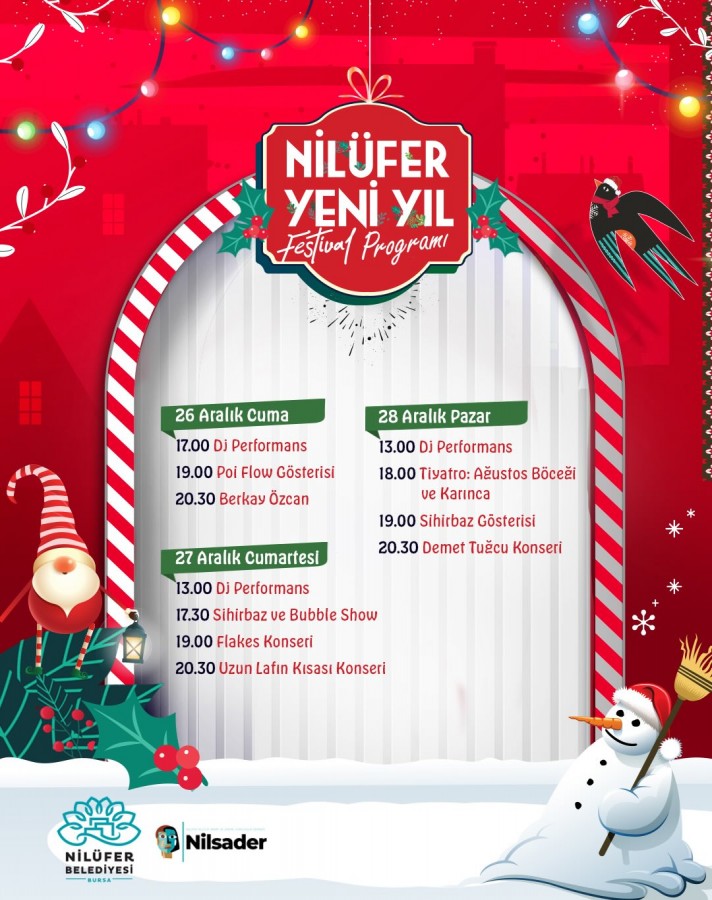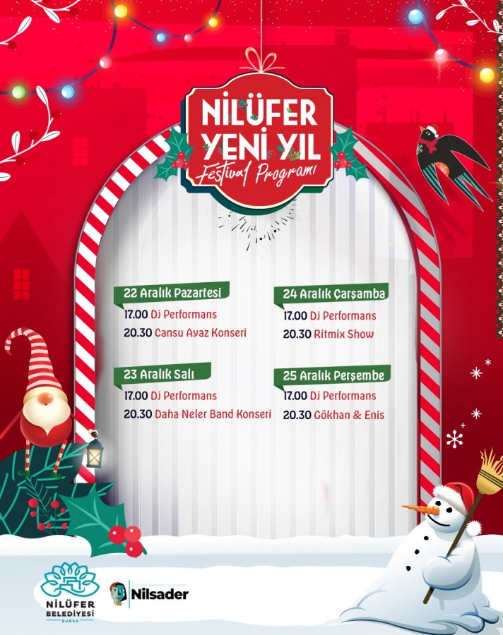 13 gün sürecek festivalin finali ise yılın son gününde yapılacak. Yeni yıl coşkusunun zirveye çıkacağı 31 Aralık akşamı, sevilen sanatçı Ufuk Beydemir sahne alarak Nilüferlilerle buluşacak.