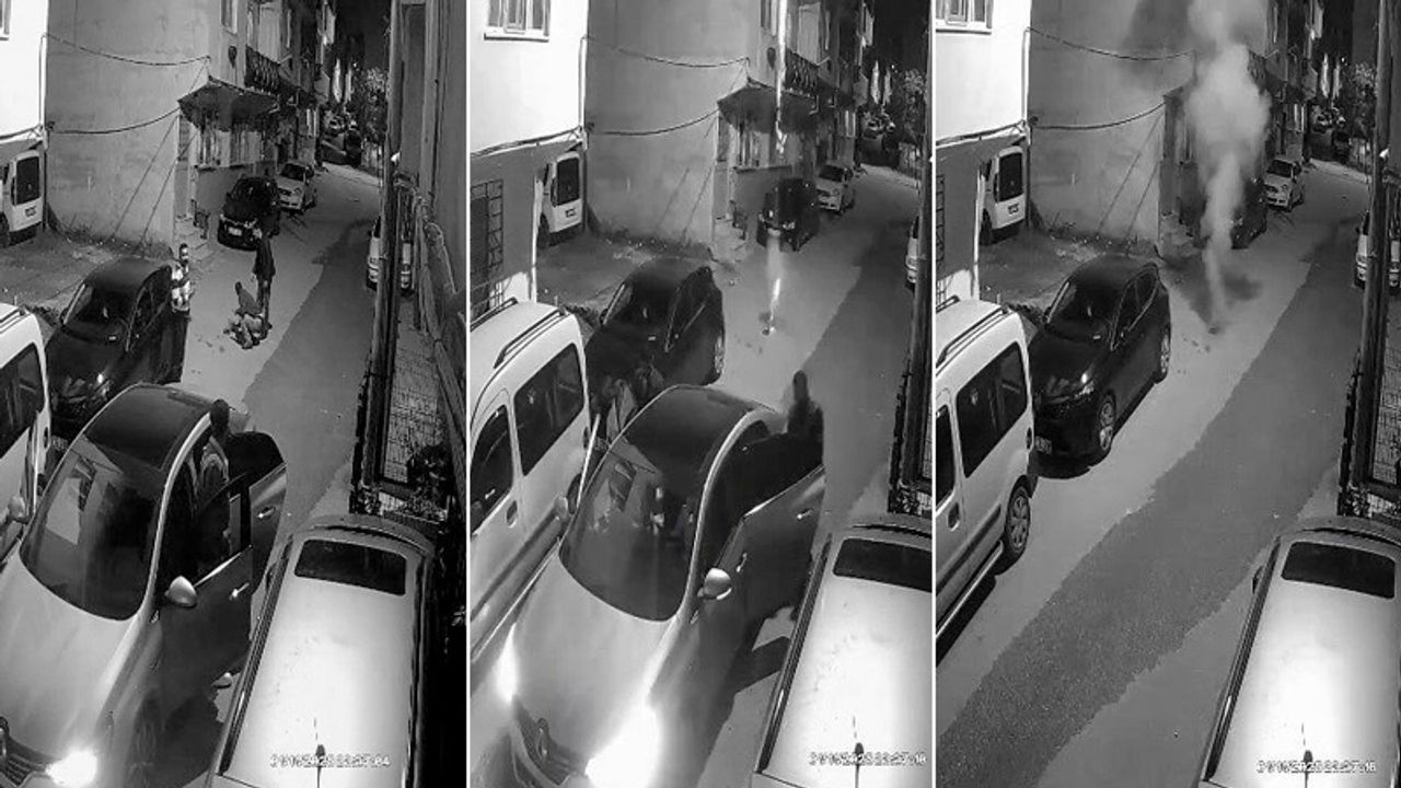 Güvenlik kameralarına yansıyan görüntüde, sokağa otomobil ile gelen 4 kişiden 2’si havai fişekleri yaktıktan sonra yeniden arabaya binip uzaklaştı.