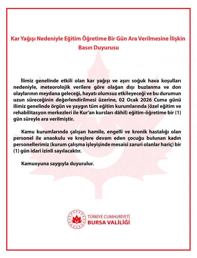 Valilikten yapılan açıklamada, meteorolojik verilere göre olağan dışı buzlanma ve don olaylarının beklendiği, bu durumun ulaşımda ve günlük yaşamda olumsuzluklara yol açabileceği belirtildi. Açıklamada, söz konusu riskler göz önünde bulundurularak 2 Ocak 2026 Cuma günü Bursa genelinde örgün ve yaygın eğitim kurumlarında eğitime bir gün süreyle ara verildiği ifade edildi.