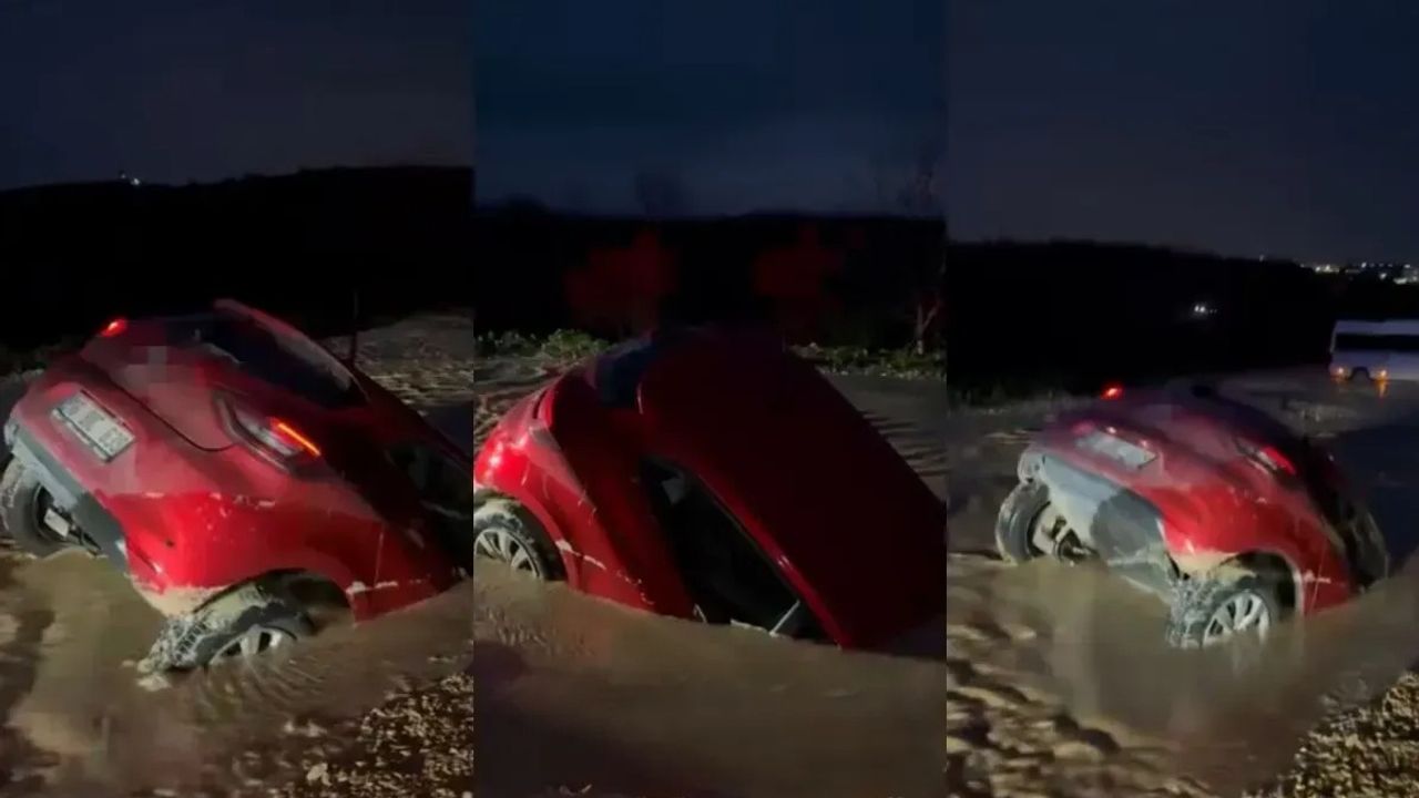 Kısa sürede yarıya kadar çamura gömülen araçta bulunan sürücü, kendi imkanlarıyla otomobilden çıkmayı başardı.