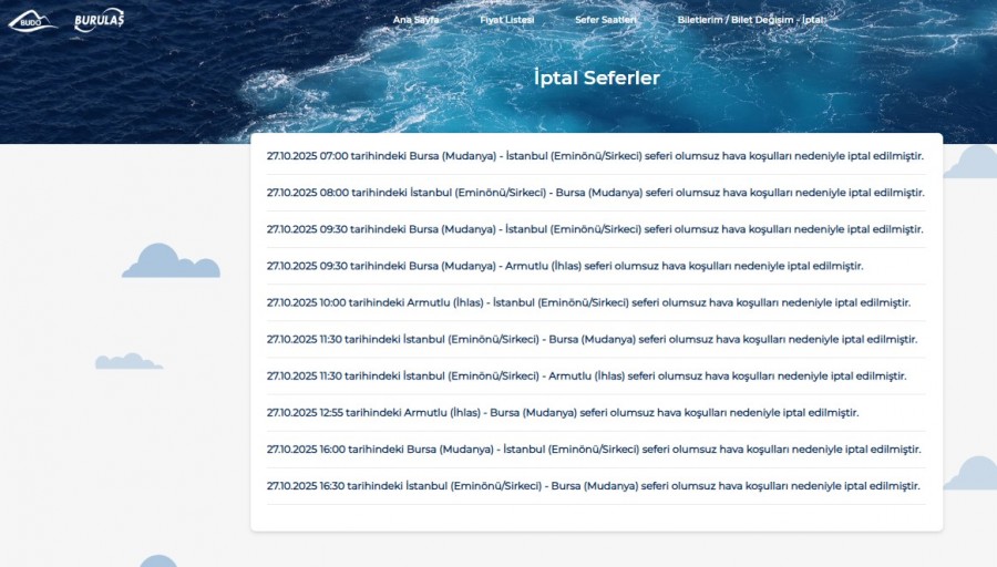 BUDO 2 seferi daha iptal etti. BUDO'nun açıklamasına göre, 27 Ekim 2025 Pazartesi günü saat 16.00'da Bursa (Mudanya)- İstanbul (Eminönü/Sirkeci) ve 16.30'da İstanbul (Eminönü/Sirkeci)-Bursa (Mudanya) seferleri olumsuz hava koşulları nedeniyle iptal edildi.