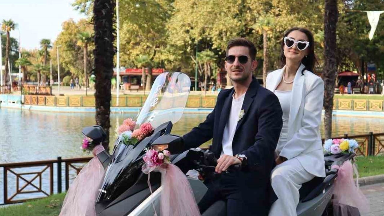 Nikâhın ardından motosikletlerini çiçek ve tüllerle süsleyen çift, düğün konvoyuna ilginç bir renk kattı. Gelinlik yerine beyaz takım tercih eden Şule Albayrak Çağın ve damat Emre Çağın, süslenmiş motosikletleriyle şehir turuna çıktı.