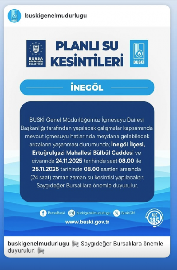 BUSKİ Genel Müdürlüğü Kanalizasyon Dairesi Başkanlığı tarafından yapılacak çalışmalar kapsamında mevcut içmesuyu hatlarında meydana gelebilecek arızaların yaşanması durumunda; İnegöl İlçesi Ertuğrulgazi Mahallesi Bülbül Caddesi ve civarında 24 Kasım tarihinde saat 08.00 ile 25 Kasım 2025 tarihinde 08.00 saatleri arasında (24 saat) zaman zaman su kesintisi yapılacaktır. Vatandaşların tedbirli olması rica olunur.