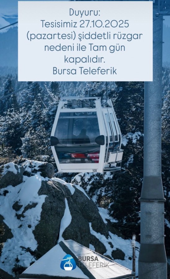 Bursa'da gece saatlerine kadar etkisini sürdürmesi beklenen lodos nedeniyle, Uludağ'a yolculuk için tercih edilen 9 kilometre uzunluğundaki teleferik hattı da kapatıldı. Bursa Teleferik İşletmesi'nin sayfasından paylaşılan duyuruda, "Tesisimiz 27.10.2025 Pazartesi şiddetli rüzgar nedeniyle tam gün kapalıdır" denildi.