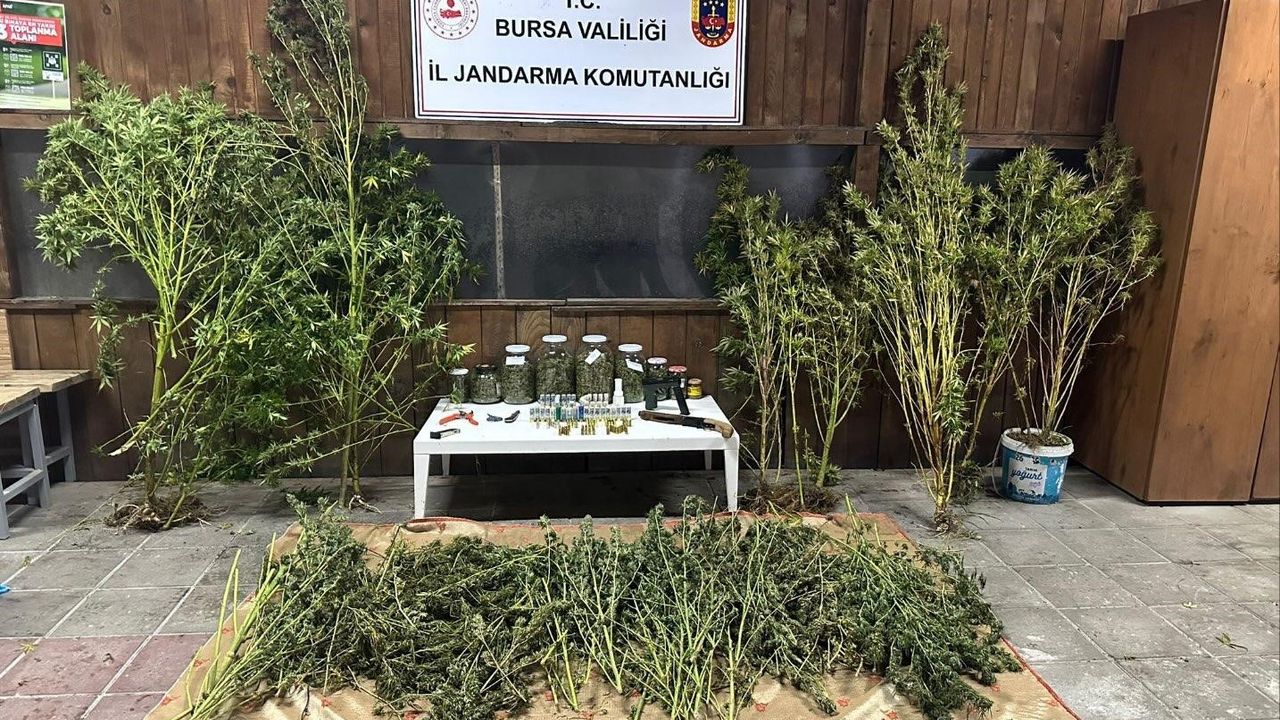 Kırsal Deydinler Mahallesi'nde, İnegöl İlçe Jandarma Komutanlığı ekiplerince bir ikamette ve bahçesinde yapılan aramada, samanlıkların altına gizlenmiş 1467 gram esrar, 9 kök kenevir bitkisi, 1 tüfek, 1 ruhsatsız tabanca, 46 tüfek kartuşu ve 30 tabanca mermisi ele geçirildi.