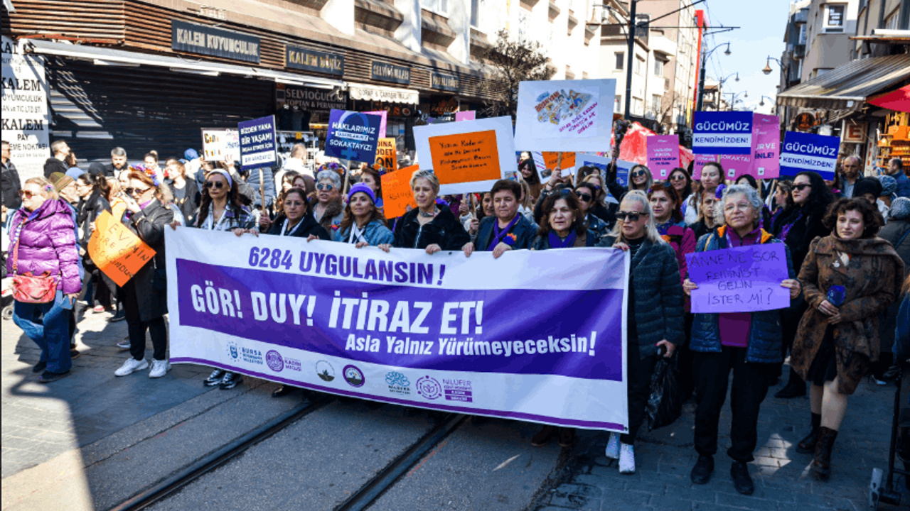 Cumhuriyet Caddesi’nden Hanlar Bölgesi’ne kadar yürüyen Bursalı kadınlar, 8 Mart Dünya Kadınlar Günü etkinlikleri kapsamında ‘Saklandığımız değil, Buluştuğumuz yerdeyiz. Biz birbirimizin çaresiyiz’ mesajını verdi. Ellerinde ‘İstismarı aklama! Asla yalnız yürümeyeceksin!’ yazılı döviz, afiş ve pankartlar taşıyan kadınlar, ‘Yaşasın kadın dayanışması’ sloganları atarak görünmez kılınmalarına, emeklerinin değersizleştirilmesine, şiddete ve ayrımcılığa karşı dayanışma mesajı verildi. Etkinliğe katılanlara rozet ve toka dağıtılırken, kadınlar saçlarına taktıkları çiçeklerle caddeyi adeta renk cümbüşüne çevirdi.