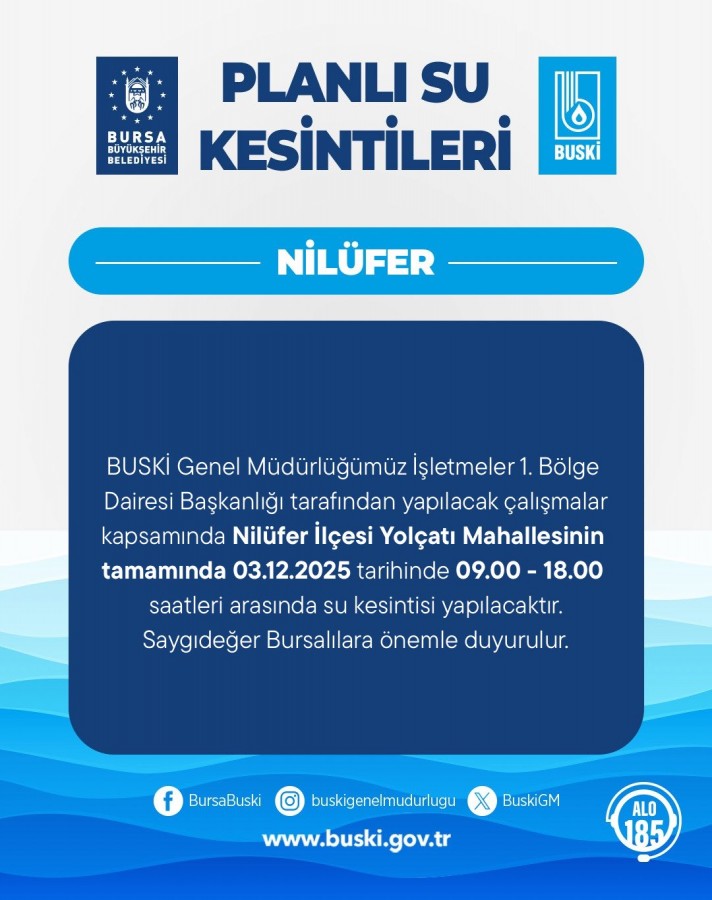 Bursa Büyükşehir Belediyesi BUSKİ Genel Müdürlüğü, İşletmeler 1. Bölge Dairesi Başkanlığı tarafından yapılacak çalışmalar nedeniyle Nilüfer ilçesine bağlı Yolçatı Mahallesi'nin tamamında su kesintisi uygulanacağını duyurdu.