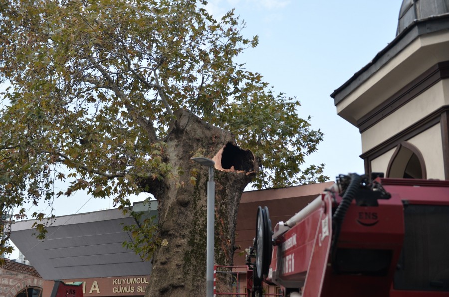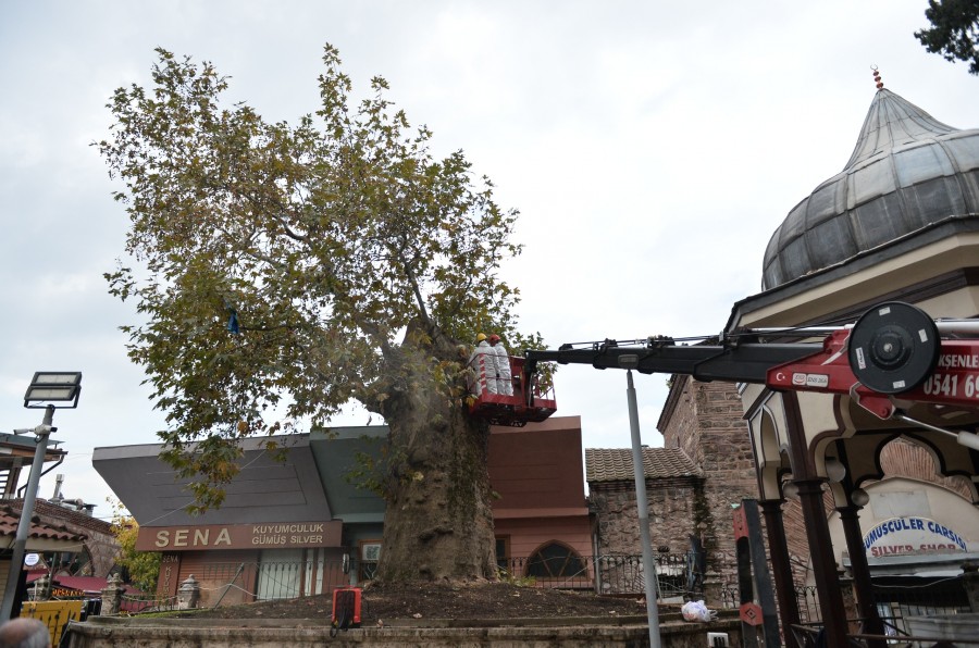 Bursa'nın simge yapılarının başında gelen Ulu Cami'nin avlusunda bulunan 346 yaşındaki asırlık çınar ağacının büyük dalı, henüz bilinmeyen bir nedenle koptu. Ağacın gövdesiyle şadırvan arasında sıkışan dal, belediye ekiplerinin çalışmasıyla bulunduğu yerden kaldırıldı. Büyükşehir Belediyesi, Bursa için kadim medeniyetin sembolü olan asırlık çınarı tekrar geleceğe taşımak için zaman kaybetmeden harekete geçti.