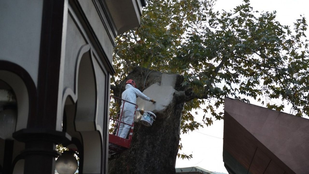 Park ve Bahçeler Dairesi Başkanlığı ekipleri tarafından yapılan incelemede, anıt ağacın açık yarasında çürümüş ve mantarlaşmış bölümler tespit edildi. Hızlı bir şekilde bakım ve restorasyon işlemlerine başlayan ekipler, özel ilaçlarla 'çürümeye yol açan' bakterileri temizledi. Ağacın iskeletine teller aracılığıyla destek uygulanırken, son aşamada özel yalıtım malzemesi kullanılarak ağacın açık yarası kapatıldı. Tedavi gören kısım boyanarak çınar ağacının formu yeniden düzenlendi.