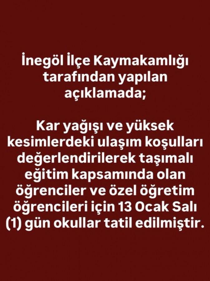 "Kar yağışı ve yüksek kesimlerdeki ulaşım koşulları değerlendirilerek, taşımalı eğitim kapsamında olan öğrenciler ve özel öğretim öğrencileri için 13 Ocak Salı günü (1 gün) okullar tatil edilmiştir."