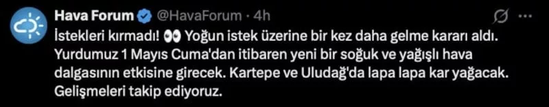 "Yurdumuz 1 Mayıs Cuma'dan itibaren yeni bir soğuk ve yağışlı hava dalgasının etkisine girecek. Kartepe ve Uludağ'da lapa lapa kar yağacak."