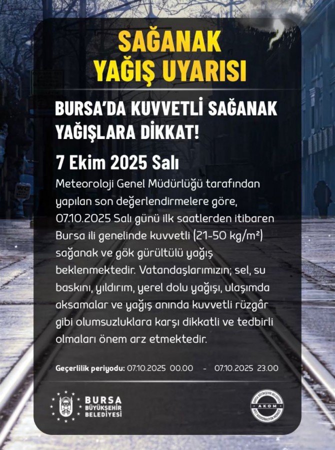 07.10.2025 Salı günü ilk saatlerden itibaren Bursa ili genelinde kuvvetli (21-50 kg/m²) sağanak ve gök gürültülü yağış beklenmektedir.