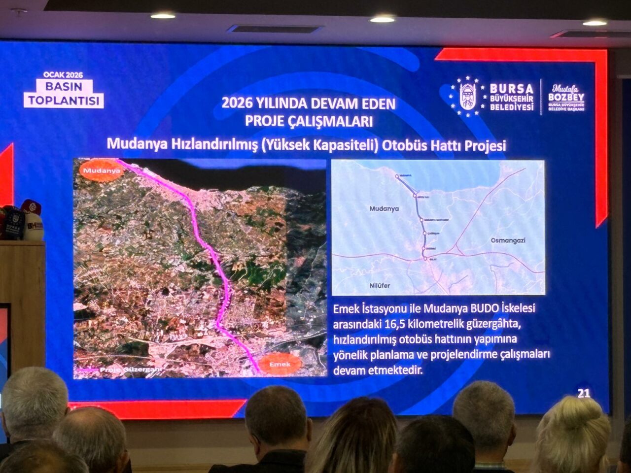 Başkan Bozbey, daha önce Mudanya’ya planladıkları metrobüs hattını yapamadıklarını onun yerine hızlı otobüs yapacaklarını söyledi. Bozbey, ''Metrobüs hattını bu yolda yapamadık. Hızlandırılmış otobüsle 16.5 kilometrelik güzergahta bu yolla birlikte deniz ulaşımını burda ile entegre hale getirmiş olacağız. Emek istasyonu ile Mudanya BUDO iskelesi arasındaki 16,5 kilometrelik güzergâhta, hızlandırılmış otobüs hattının yapımına yönelik planlama ve projelendirme çalışmaları devam etmektedir.'' dedi.