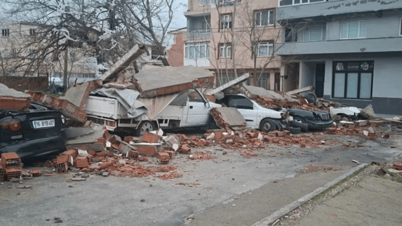 Bursa'da saatteki hızı 105,5 kilometreye ulaşan fırtına hayatı olumsuz etkiledi. Bir evin bahçe duvarının yıkılmasıyla 10 araç hasar görürken, fırtınanın verdiği hasar gündüz görüntülendi.