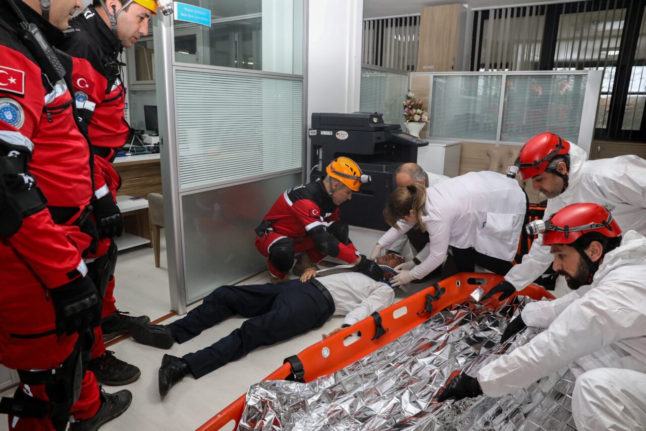 BUSKİ Genel Müdürlüğü Binası’nda gerçekleştirilen tatbikat ile deprem ve yangın senaryolarında aşamalı olarak yapılması gerekenler aktarıldı. Senaryo gereği bina hızlı ve güvenli bir şekilde boşaltılırken BUSKİ Arama Kurtarma Ekibi de uzman kadrosuyla olay yerinde görev aldı. Yangın durumundaki olası gaz sızıntıları ekipler tarafından titizlikle kontrol edildi. Çalışanların yaralandığı senaryolardaki tahliye işlemleri de gerçeğe uygun şekilde canlandırıldı.