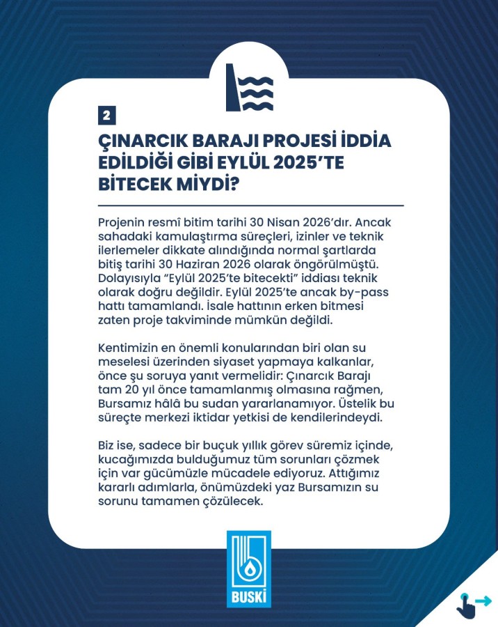 Açıklamada kamuoyuna yansıyan asılsız iddialara yanıt verilerek, "Kentimizin en önemli konularından biri olan su meselesi üzerinden siyaset yapmaya kalkanlar, önce şu soruya yanıt vermelidir: Çınarcık Barajı tam 20 yıl önce tamamlanmış olmasına rağmen, Bursamız hâlâ bu sudan yararlanamıyor. Üstelik bu süreçte merkezi iktidar yetkisi de kendilerindeydi. Biz ise, sadece bir buçuk yıllık görev süremiz içinde, kucağımızda bulduğumuz tüm sorunları çözmek için var gücümüzle mücadele ediyoruz. Attığımız kararlı adımlarla, önümüzdeki yaz Bursamızın su sorunu tamamen çözülecek" ifadelerine de yer verildi.