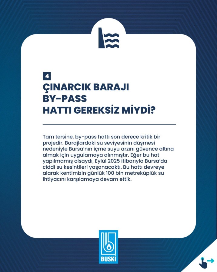 Tam tersine, by-pass hattı son derece kritik bir projedir. Barajlardaki su seviyesinin düşmesi nedeniyle Bursa'nın içme suyu arzını güvence altına almak için uygulamaya alınmıştır. Eğer bu hat yapılmamış olsaydı, Eylül 2025 itibarıyla Bursa'da ciddi su kesintileri yaşanacaktı. Bu hattı devreye alarak kentimizin günlük 100 bin metreküplük su ihtiyacını karşılamaya devam ettik.
