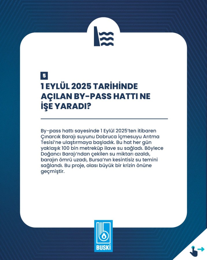 By-pass hattı sayesinde 1 Eylül 2025'ten itibaren Çınarcık Barajı suyunu Dobruca İçmesuyu Arıtma Tesisi'ne ulaştırmaya başladık. Bu hat her gün yaklaşık 100 bin metreküp ilave su sağladı. Böylece Doğancı Barajı'ndan çekilen su miktarı azaldı, barajın ömrü uzadı, Bursa'nın kesintisiz su temini sağlandı. Bu proje, olası büyük bir krizin önüne geçmiştir.