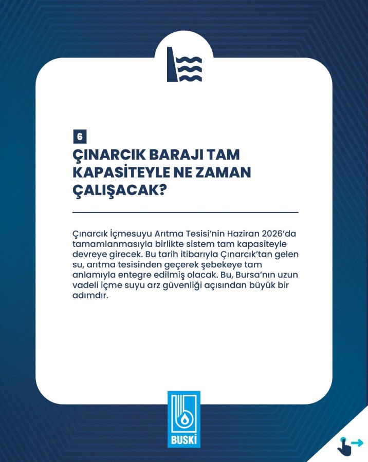 Çınarcık İçmesuyu Arıtma Tesisi'nin Haziran 2026'da tamamlanmasıyla birlikte sistem tam kapasiteyle devreye girecek. Bu tarih itibarıyla Çınarcık'tan gelen su, arıtma tesisinden geçerek şebekeye tam anlamıyla entegre edilmiş olacak. Bu, Bursa'nın uzun vadeli içme suyu arz güvenliği açısından büyük bir adımdır.