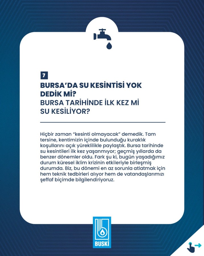 Hiçbir zaman "kesinti olmayacak" demedik. Tam tersine, kentimizin içinde bulunduğu kuraklık koşullarını açık yüreklilikle paylaştık. Bursa tarihinde su kesintileri ilk kez yaşanmıyor; geçmiş yıllarda da benzer dönemler oldu. Fark şu ki, bugün yaşadığımız durum küresel iklim krizinin etkileriyle birleşmiş durumda. Biz, bu dönemi en az sorunla atlatmak için hem teknik tedbirleri alıyor hem de vatandaşlarımızı şeffaf biçimde bilgilendiriyoruz.