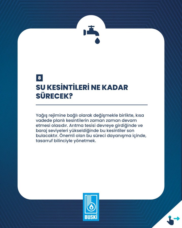 Yağış rejimine bağlı olarak değişmekle birlikte, kısa vadede planlı kesintilerin zaman zaman devam etmesi olasıdır. Arıtma tesisi devreye girdiğinde ve baraj seviyeleri yükseldiğinde bu kesintiler son bulacaktır. Önemli olan bu süreci dayanışma içinde, tasarruf bilinciyle yönetmek.