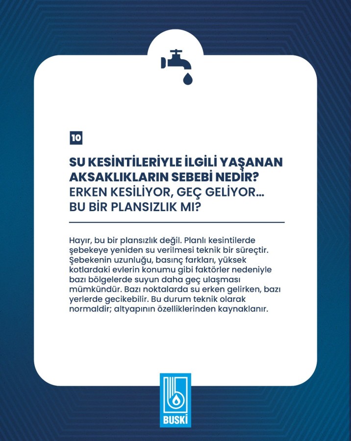 Öte yandan vatandaşların sıkça dile getirdiği "erken kesiliyor, geç geliyor" şikâyetlerine de yanıt verildi. Planlı kesintilerde şebekeye yeniden su verilmesinin teknik bir süreç olduğuna dikkat çeken BUSKİ, şebekenin uzunluğu, basınç farkları ve yüksek kotlardaki evlerin konumu gibi faktörler nedeniyle bazı bölgelerde suyun daha geç ulaşmasının mümkün olduğunu açıkladı.