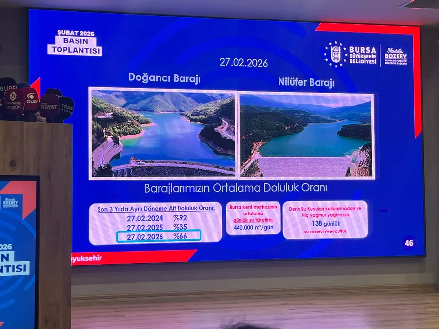 Başkan Bozbey, 28 Şubat itibarıyla barajlardaki doluluk oranlarını kamuoyuna açıkladı: Doğancı Barajı: %56, Nilüfer Barajı: %78,52, genel ortalama: %67,3.