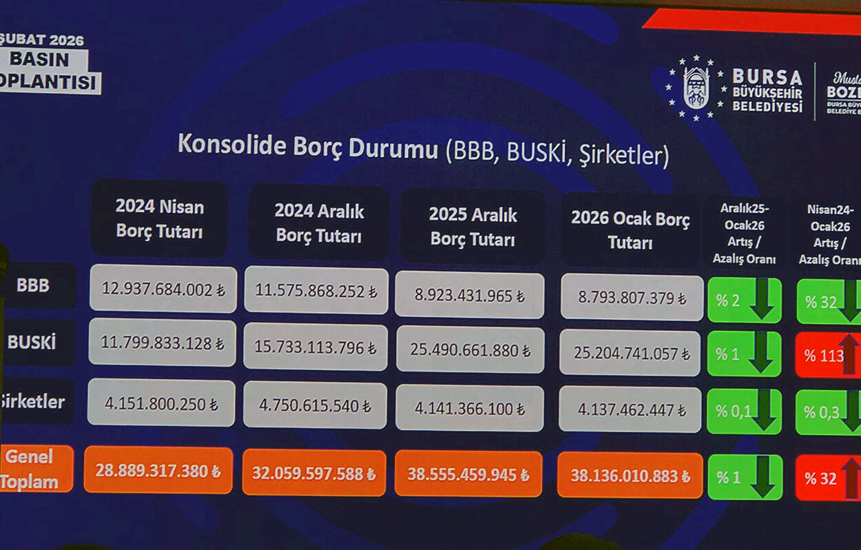 Bursa Büyükşehir Belediyesi, şirketleri dahil olmak üzere vergi ve SGK borçlarını tamamen sıfırladığını açıkladı. Belediye Başkanı Mustafa Bozbey, mali disiplin sayesinde belediyenin güçlü finansal yapıya kavuştuğunu söyledi.
