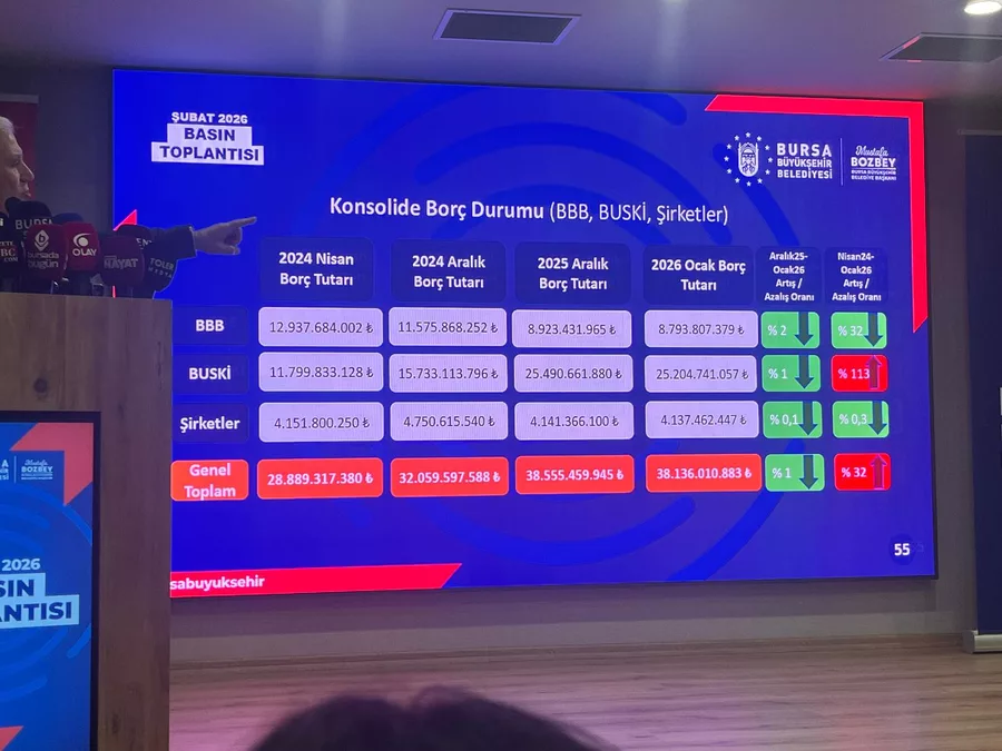 Bursa Büyükşehir Belediyesi'nin mali tablosu kamuoyuyla paylaşıldı. Başkan Mustafa Bozbey tarafından Şubat ayı değerlendirme toplantısında açıklanan verilere göre 2024 yılı Nisan ayında 28 milyar 889 milyon lira olan toplam konsolide borç, aynı yılın Aralık ayında 32 milyar 59 milyon liraya yükseldi.
