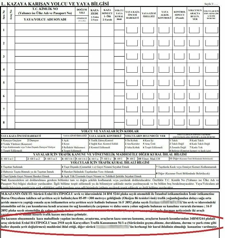 Olayın görgü tanıklarına göre, F.G. hakimiyetindeki otomobilin sürat yaptığı ve makas atarak trafiği tehlikeye attığını kaydeden Hatipoğlu, “Kaza krokisinde hatalı bir çizim var. Araç şeridinde giderken tam önüne kırmış şeklinde görünüyor. Bize başka bir kamera kaydı verilmedi ama verilen kamera kaydında da anlaşılıyor ki araç sol şeritten orta şeride araçlar arasında makas atarak geçiyor. İş çıkış saatine göre oldukça süratli ve babama çarpıyor. Bize babamın yüzde yüz kusurlu olduğu söylendi. Bunun sebebini de şerit ihlali olduğunu söylediler. Karşı tarafın süratli gittiği ve makas attığına dair görüntü ve görgü tanıkları var. Görgü tanıklarını jandarma ve savcı dinlemedi. Bölge trafik ekiplerinin kaza tutanağında babam yüzde yüz kusurlu görüldüğü için kovuşturmaya gerek duyulmadı ‘mahkemeniz görülmeyecek’ dendi. Biz buna itirazlarda bulunduk ama itirazlarımız reddedildi. Üstelik bize ‘kovuşturmaya yer yoktur’ ibareli yazı geldi. Babama çarpan şahıs F.G. ifadesinde ‘çarptım ve aracım fırladı’ demiş olmasına rağmen bize gelen ifadede babam hakimiyetini kaybetmiş ve karşı tarafa çarpmış şeklinde yazılmış. Oysaki bu şahsın ifadesinde ve kamera kaydıyla çelişiyor. Bu tamamen anlamsız bir karar. İtirazlarımız hiçbir şekilde bunu değiştiremedi ve biz bunu anlayamıyoruz” şeklinde konuştu.
