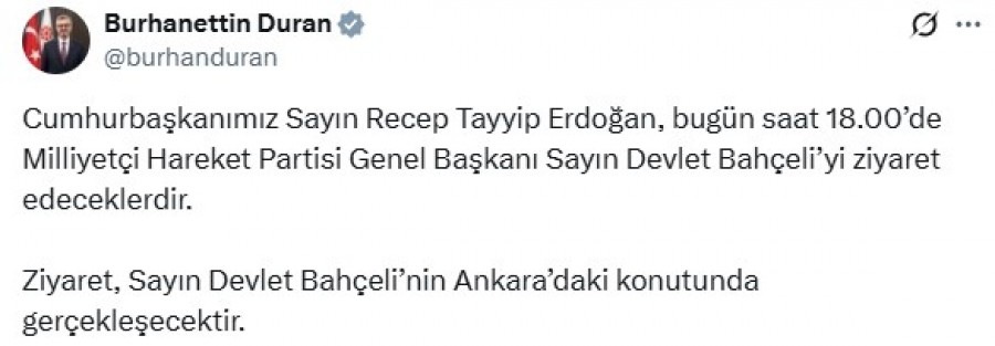 İletişim Başkanı Burhanettin Duran, sosyal medya hesabından yaptığı açıklamada, "Cumhurbaşkanımız Sayın Recep Tayyip Erdoğan, bugün saat 18.00'de Milliyetçi Hareket Partisi Genel Başkanı Sayın Devlet Bahçeli'yi ziyaret edeceklerdir. Ziyaret, Sayın Devlet Bahçeli'nin Ankara'daki konutunda gerçekleşecektir" dedi.