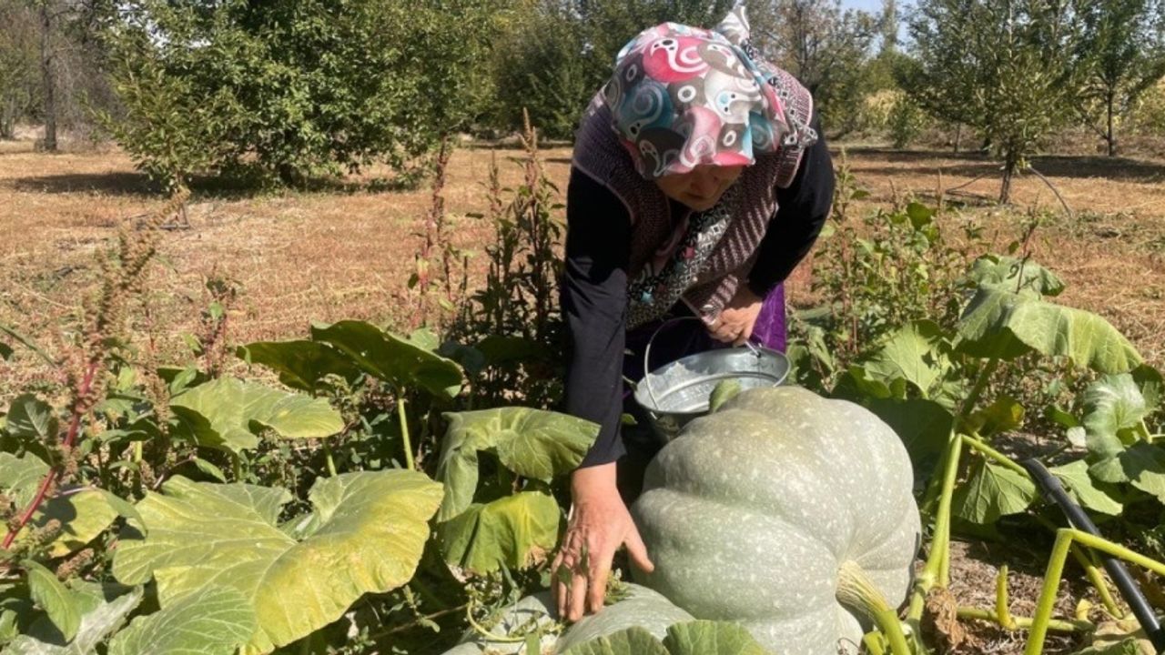 Meyve bahçesinin bir kısmında kendi tüketeceği kadar fasulye, biber, domates ve bal kabağı yetiştiren çiftçi Yurdagül Çavdar, ekimde soğukların etkili olmasıyla bahçesindeki son ürünleri toplamaya gitti.