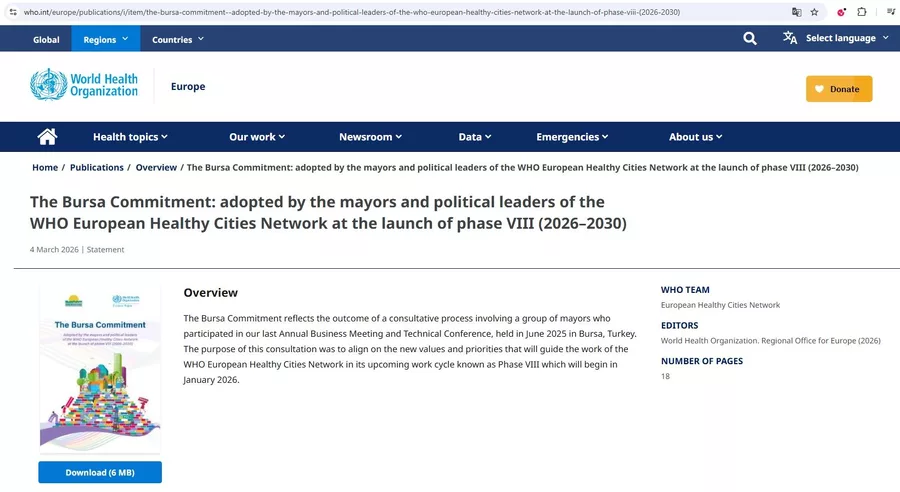 Bursa Taahhüdü, Dünya Sağlık Örgütü'nün resmi internet sitesinde yayımlanarak küresel kamuoyuyla paylaşıldı. Böylece sağlıklı şehirler vizyonu doğrultusunda yerel yönetimlere yönelik önemli bir referans belgesi niteliği kazandı.
