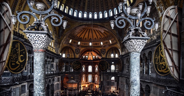 Üst katından çekilen görüntülerde Ayasofya Camii yeni çehresiyle hayran bıraktı. 86 yıl sonra 24 Temmuz’da yeniden ibadete açılan Ayasofya-i Kebir Cami-i Şerifi içinde bulunan ve ana kubbenin bir bölümünü kapatan dev iskele geçtiğimiz günlerde kaldırılmıştı.