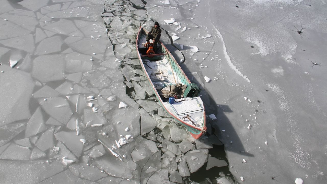 Balıkçılar, buzların her gün daha da kalınlaştığı göl yüzeyinde donun olmadığı açıklara doğru çıkabilmek için kendilerine buzlar arasında yol açmak amacıyla saatlerce mesai yapıyor. Bir balıkçı teknesinin kıyıda yürüttüğü bu zorlu mesai havadan da görüntülendi.