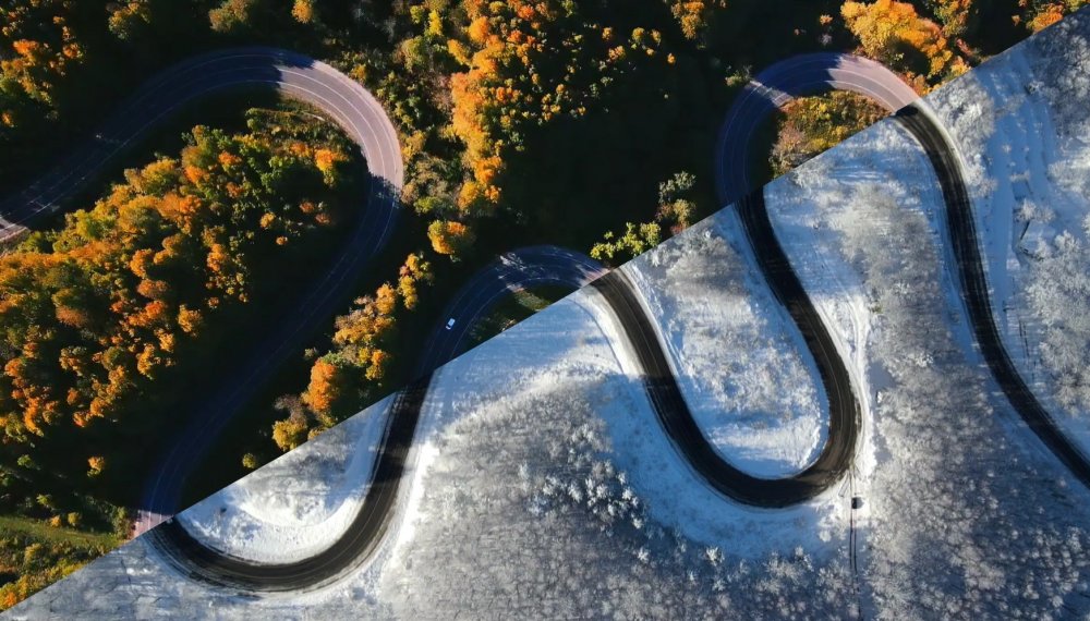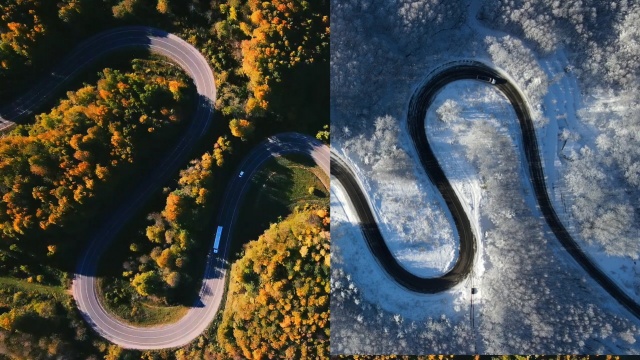 Doğa ve yaban hayat fotoğrafçısı Samet Asutay’ın drone ile çektiği İnegöl ilçesi ile Kütahya'nın Domaniç ilçesi arasındaki yolda iki mevsim arasındaki geçiş montajlanınca ortaya muhteşem görüntüler çıktı.
