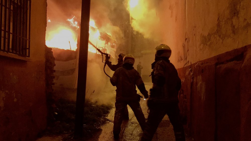 Bursa’da bina önünde park halinde bulunan iki otobüs, alevler içinde kaldı. Alevler geceyi aydınlatırken, yan binada oturan yaşlı çift dumandan etkilendi. Yangın çevre binalara sıçramasına karşı tedbir amaçlı bina tahliye edildi. İtfaiye ekiplerinin söndürdüğü araçlar, kullanılamaz hale geldi.
