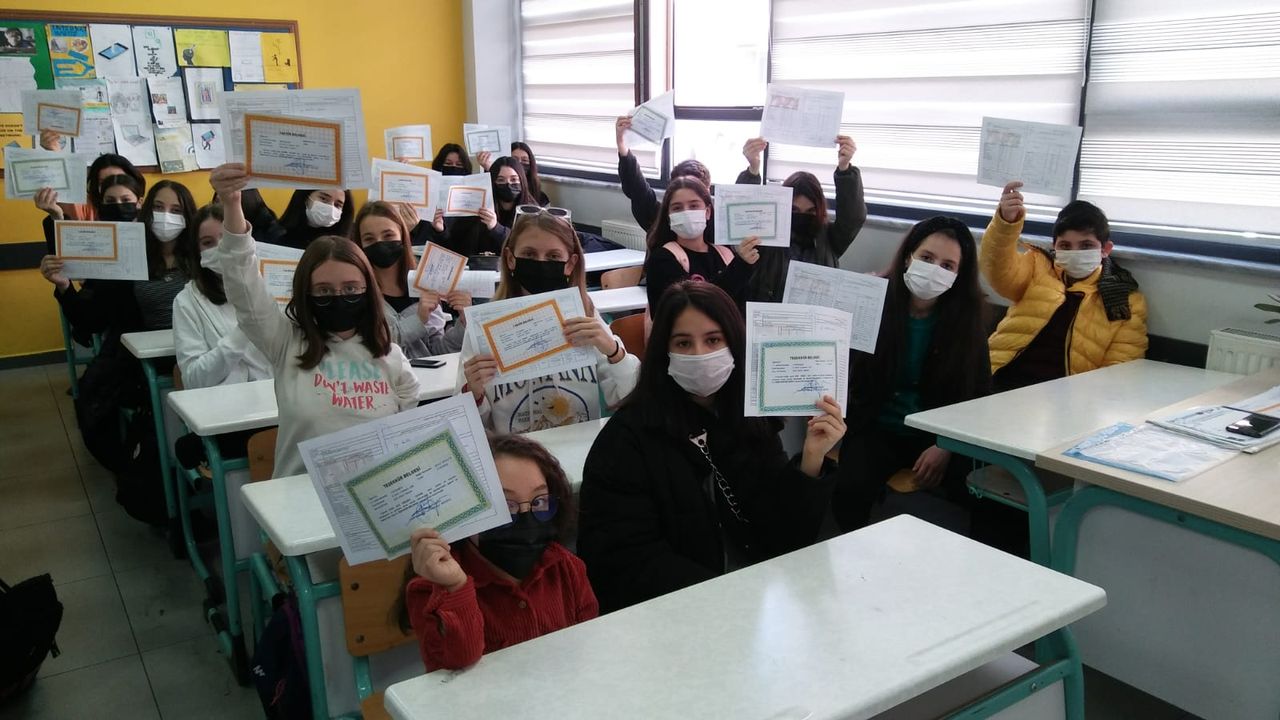 Çocuklara karnelerini Şube Müdürleri Mehmet İşleyen ve Mehmet Toksay ile Okul Müdürü Nurettin Kendüzler, Müdür Yardımcısı Muhammed Demirtaş ve Sınıf Sorumlusu İngilizce Öğretmeni Pınar Çakır tarafından verildi