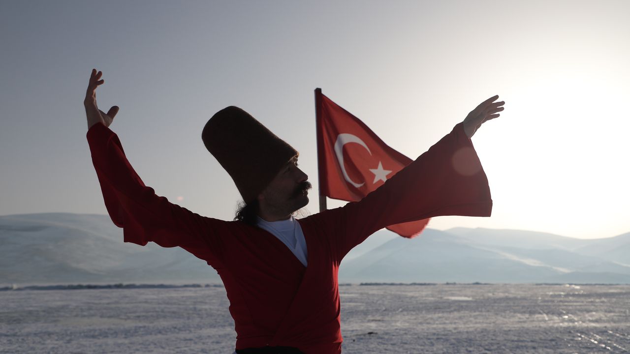 Ardahan Üniversitesi (ARÜ) Teknik Bilimler Meslek Yüksekokulu Öğretim Görevlisi Özkan Karadavut, Çıldır gölü ve bölgenin tanıtımı için buzla kaplı göl yüzeyinde sema gösterisi gerçekleştirdi.
