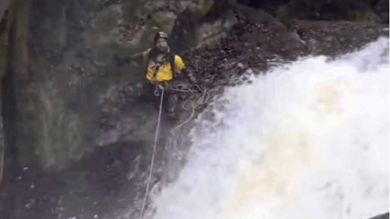 Aksiyon peşinde olan dağcı İbrahim Taşçı, büyük bir gürültüyle akan sudan soğukkanlılığı ve tecrübesi sayesinde tehlikeli bölgeden çıkmayı başardı.